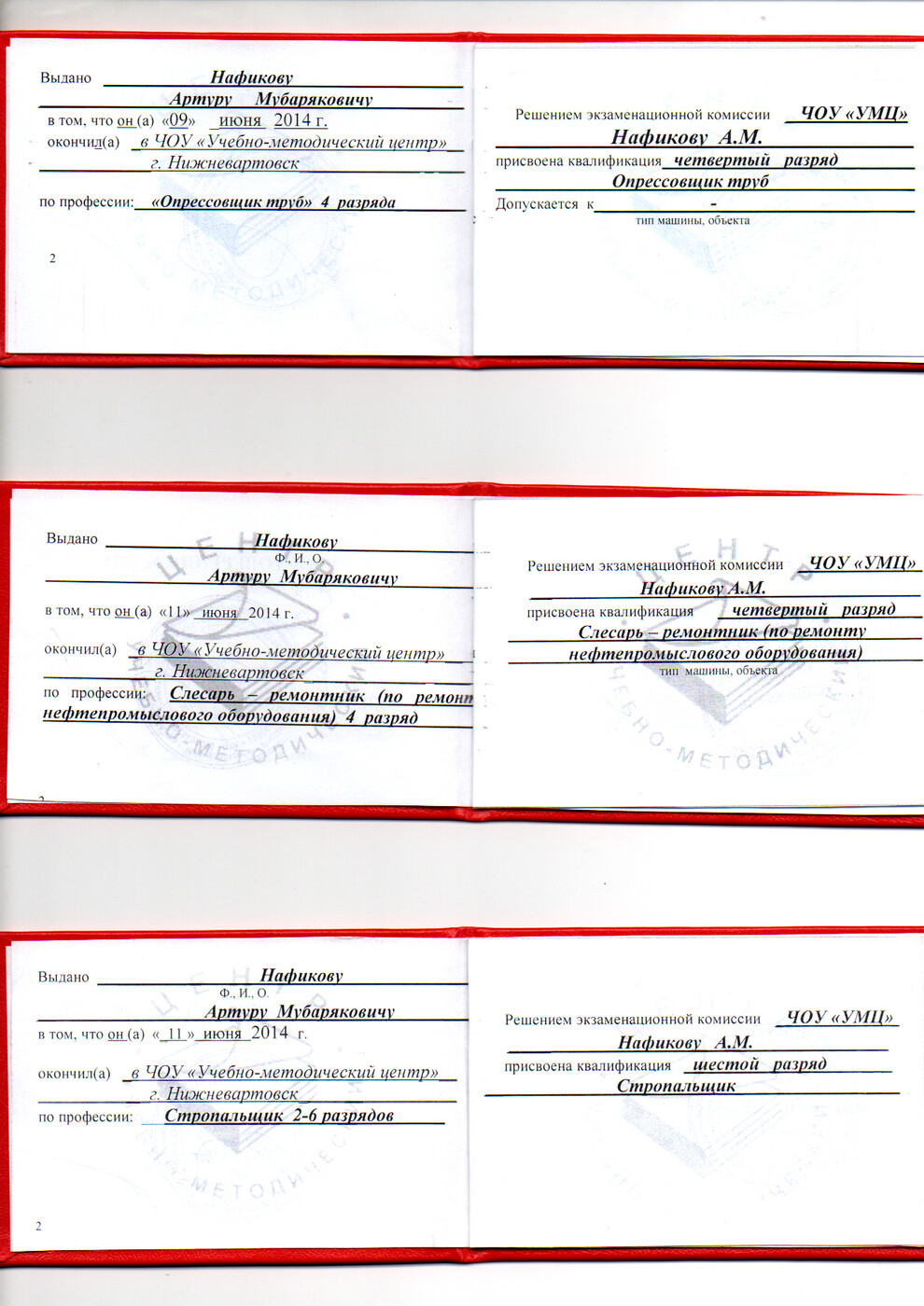 Удостоверение: Слесарь-ремонтник( по ремонту нефтепромыслового оборудования)